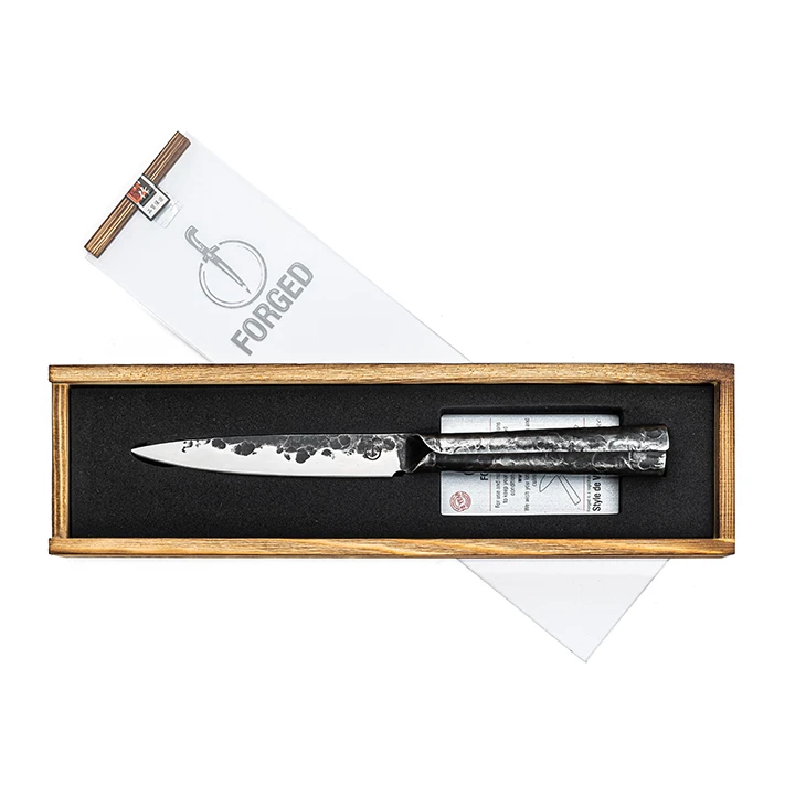 Het merk Forged staat voor een bijzondere en opvallende koksmessencollectie. Door het bijzondere uiterlijk, de mooie verpakking en het volledige handwerk zal dit menig messenliefhebber zijn hart sneller doen laten kloppen. 100% handgesmeed, verpakt in bijzonder gebrand houten kistje. Ieder mes is een UNIEK stuk! Verpakt in een luxe houten kist. NIET vaatwasmachinebestendig. Direct na het afwassen drogen met een doek. De Brute Forged messen collectie is verkrijgbaar als losse messen of als 3-delige messenset. De collectie bestaat uit een: Koksmes, Universeel mes, Hakbijl, Broodmes, Vleesmes, Schilmes.