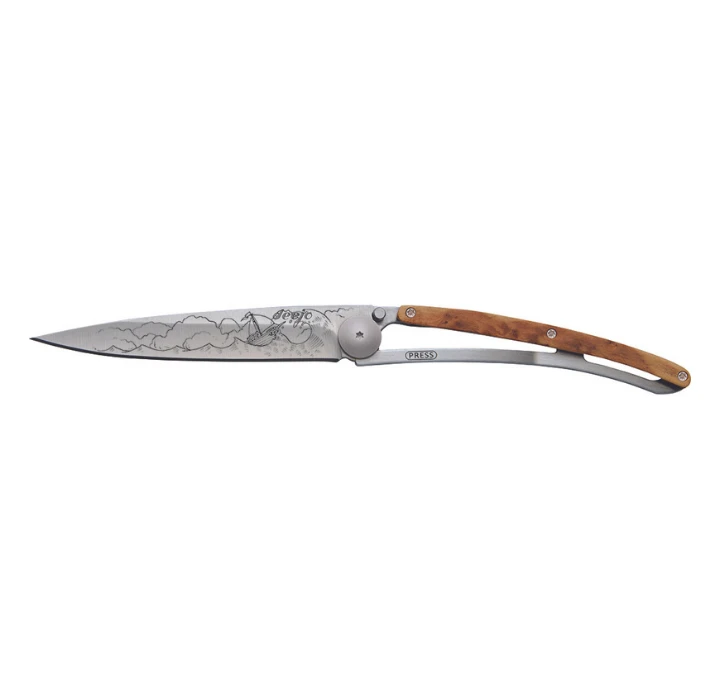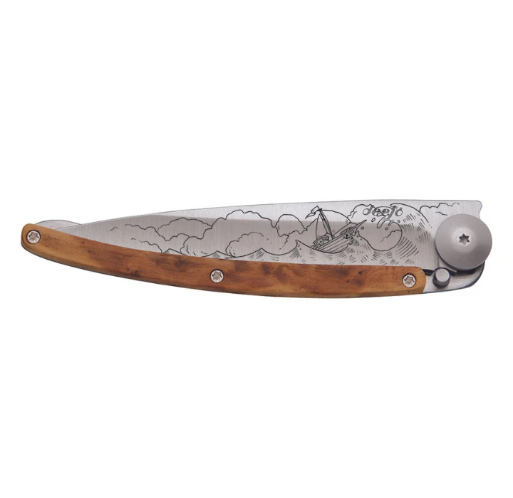 Dit 37 grams ultra lichtgewicht zakmes met jeneverbes-houten heft en gave ‘open sea’ tattoo is de perfecte toevoeging aan je dagelijkse gear. Of het nou gaat om een appeltje schillen, brief openen of wat touw doorsnijden, dit flinterdunne vlijmscherpe mes is je beste kamaraad voor de klus. Sophisticated genoeg voor je kantoorbaan, uniek genoeg om je vrienden te verbazen en minimalistisch genoeg om geen gram teveel toe te voegen aan je outdoor-uitrusting. Met deze gave Deejo kom je fris voor de dag.