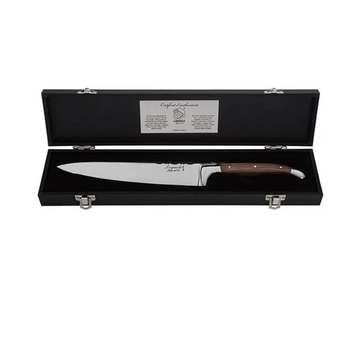 Laguiole Frans koksmes (olijf houten handvat) inclusief luxe zwart houten kistje.Een ideale starterset voor iedereen die wilt overstappen naar betere messen. Het mes is een echte alleskunner en is geschikt voor groenten, fruit, vlees en vis. Uiteraard heeft ook dit Frans koksmes het beroemde Laguiole ontwerp compleet met bij en markering op het lemmet. Het olijfhouten handvat geeft het mes karakter en het heeft hierdoor een tijdloos design. verpakt in luxe zwart houten kistje. Olijfhouten handvat. Niet geschikt voor in de vaatwasmachine