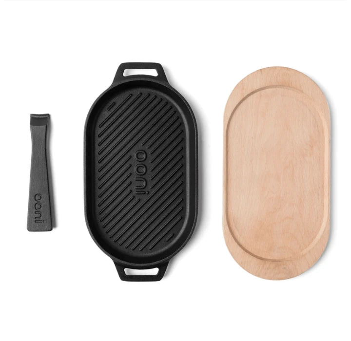 Daar is ie dan: De Ooni Grizzler Pan! De Ooni Grizzler Pan weerstaat hoge temperaturen die nodig zijn voor een goed en mooi grillresultaat en is perfect voor uw vlees, vis en groenten. Daarnaast heeft u een mooi grillpatroon met een uniek Ooni logo. De Ooni Grizzler Pan is te gebruiken in alle Ooni ovens, tevens ook geschikt voor de barbecue, oven en voor keukengebruik. Een handig afneembaar handvat en een houten serveerplank zijn meegeleverd. Gemakkelijk te onderhouden.