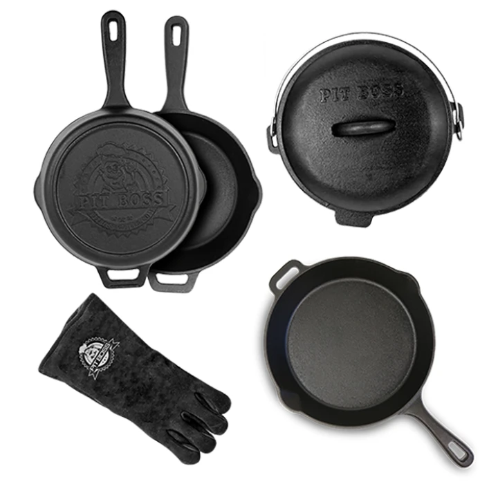 Met de Pit Boss 6-delige gietijzeren starterset kunt je al jouw favoriete maaltijden meenemen van de keuken naar de grill of waar je ook bent. Deze set bestaat uit een koekenpan met lange steel, een diepe koekenpan met deksel, Dutch Oven met deksel, en een heavy-duty lederen kookhandschoen.
