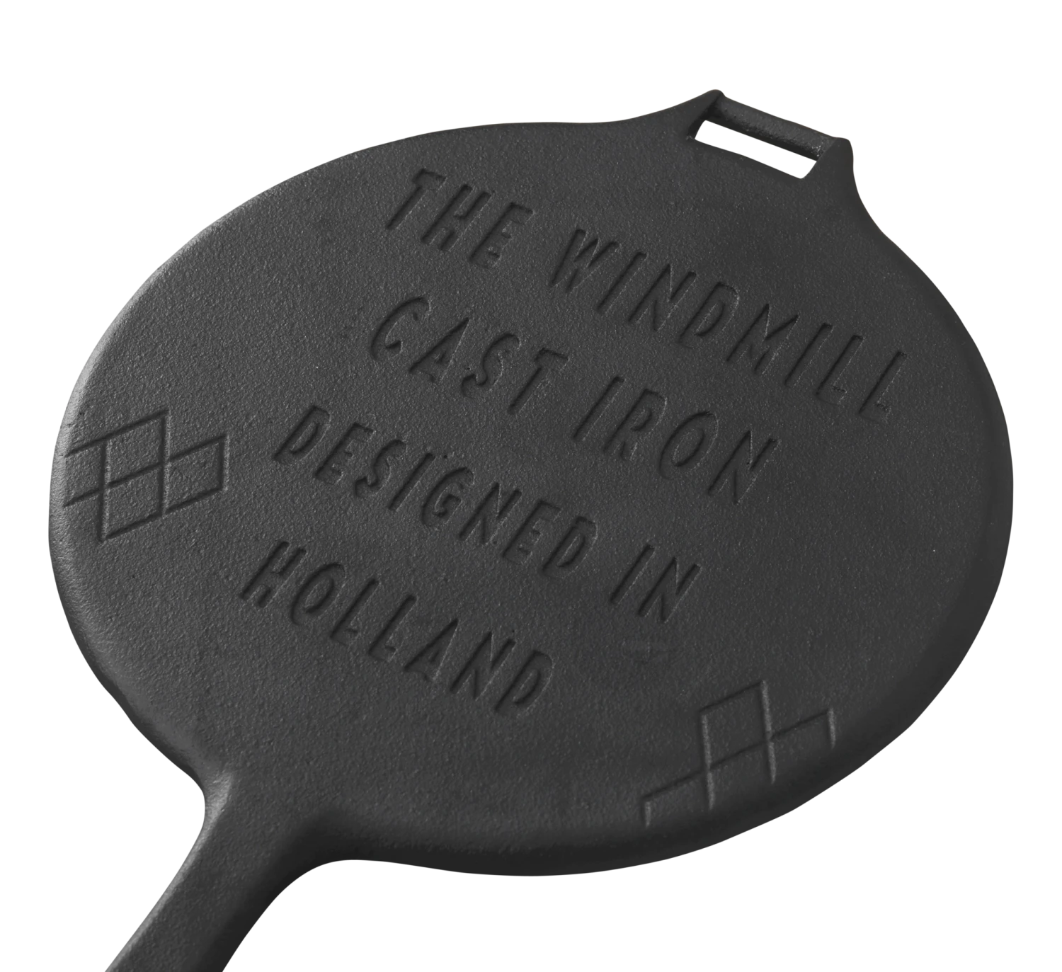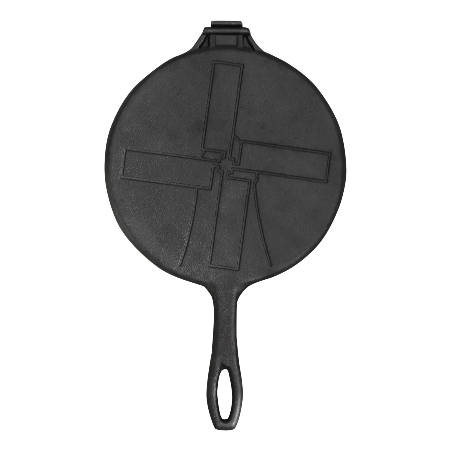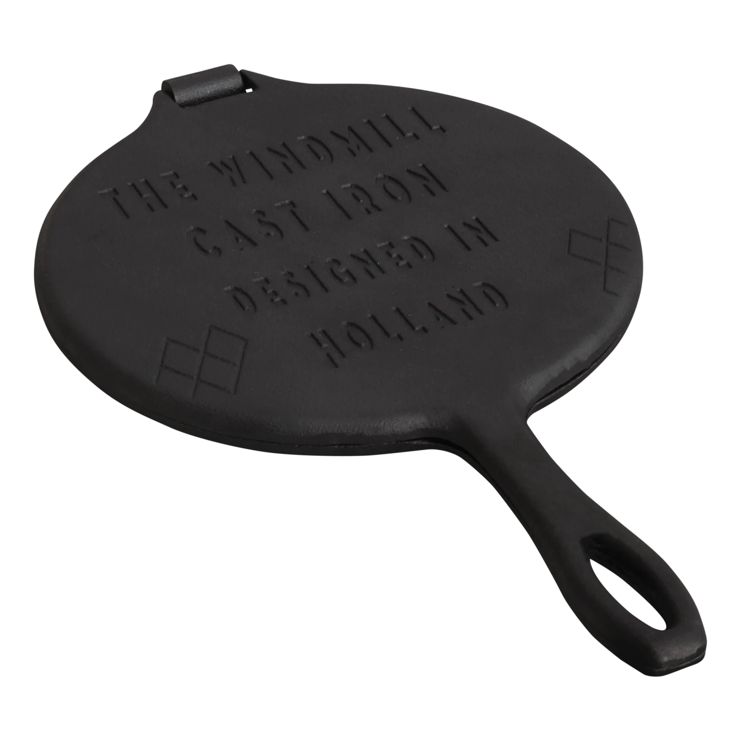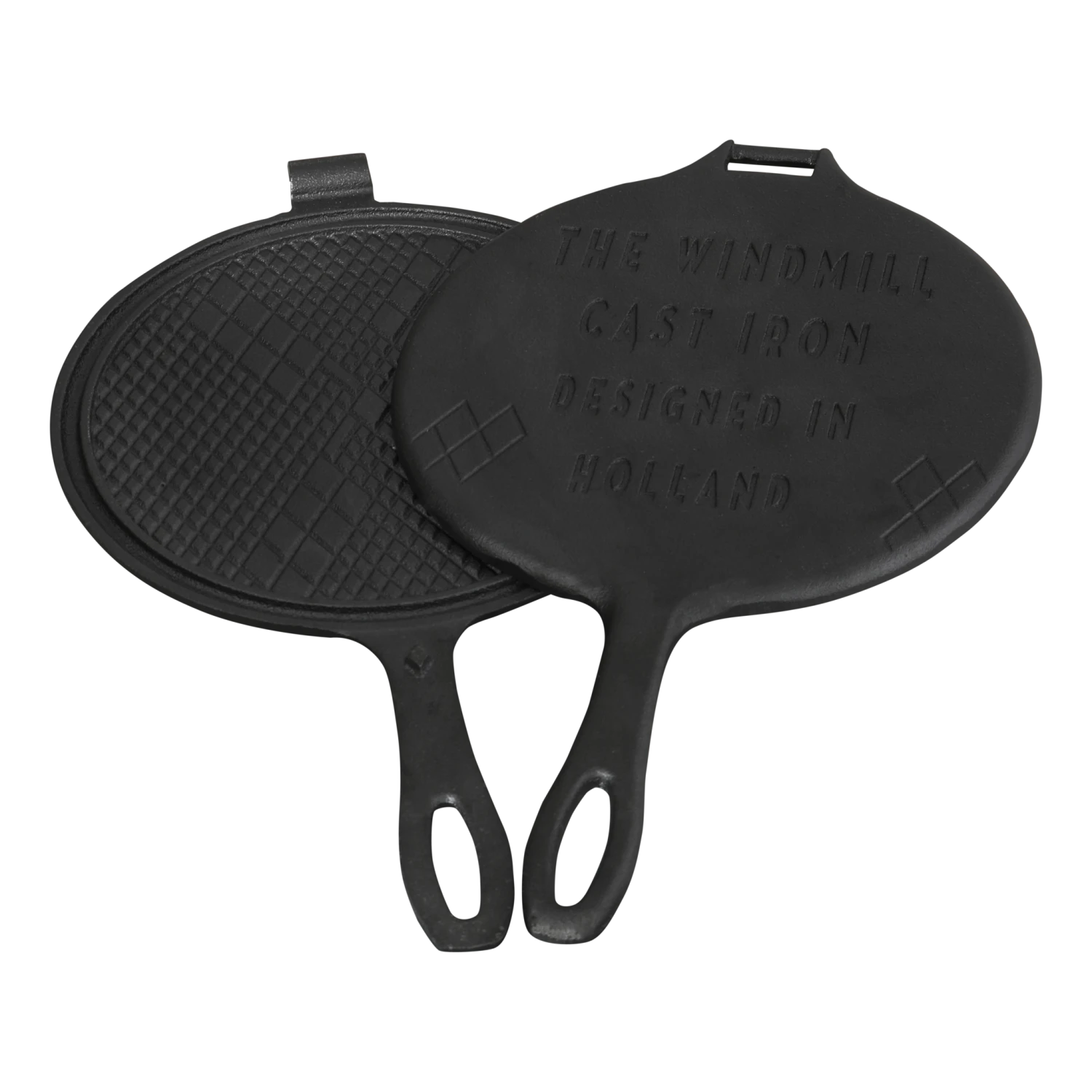 Gietijzeren stroopwafelijzer met handvat. Bestaande uit twee demontabele zijden. Tijdens het bakken eenvoudig om te draaien zodat de wafel aan beide zijden bruin wordt.